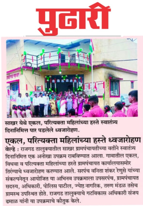 स्वातंत्र्यदिनाचा अभिमान आणि स्त्रीशक्तीचा गौरव, ग्रामपंचायत साखर येथे स्वातंत्र्यदिनाच्या निमित्ताने गावातील एकल, विधवा व परित्यक्ता महिलांच्या हस्ते ग्रामपंचायत कार्यालयासमोर तिरंग्याचे ध्वजारोहण करण्यात आले. हा उपक्रम मा. गजानजी पाटील मा. मुख्य कार्यकारी अधिकारी, जिल्हा परिषद पुणे यांच्या स्तुत्य उपक्रमाच्या अनुषंगाने व मा. गटविकास अधिकारी संजयजी ढमाळ साहेब यांच्या प्रेरणादायी मार्गदर्शनाखाली पार पडला.